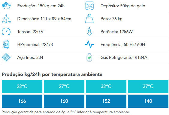 A Máquina de Gelo em Cubo 150KG/24H Everest EGC-150 220V traz toda a qualidade e inovação da Everest, referência em fabricação de gelo. Com potência de 1256W, produz até 150KG de gelo em 24 horas e armazena até 50KG. Fabricada em aço inox 304, garante durabilidade e higiene. Utiliza gás R-134 e consome 904,32 KWh/mês. Conta com dreno de água para facilitar a limpeza. O fabricador de gelo inclui manual, mangueira, pá e filtro. Produza até 281 cubos por hora com a confiabilidade da Everest EGC-150 e tenha gelo sempre disponível para seu negócio! Garanta já a sua e mantenha seu estoque de gelo sempre cheio!